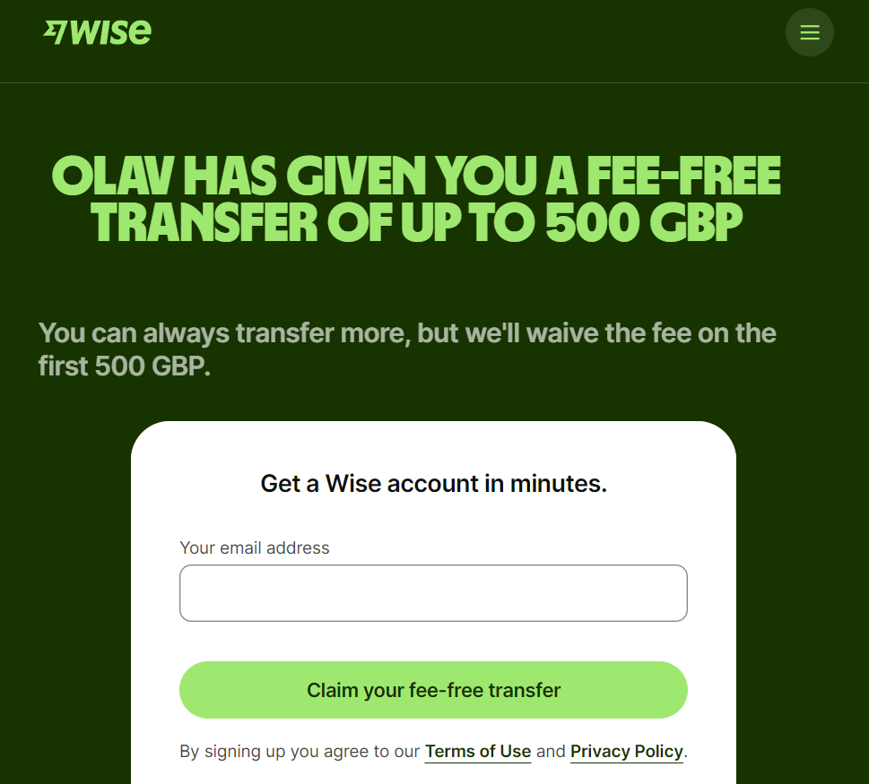 To get started fast and to receive a fee-free international transfer of GBP 500, you can use this link: https://wise.com/invite/dic/olavh12.