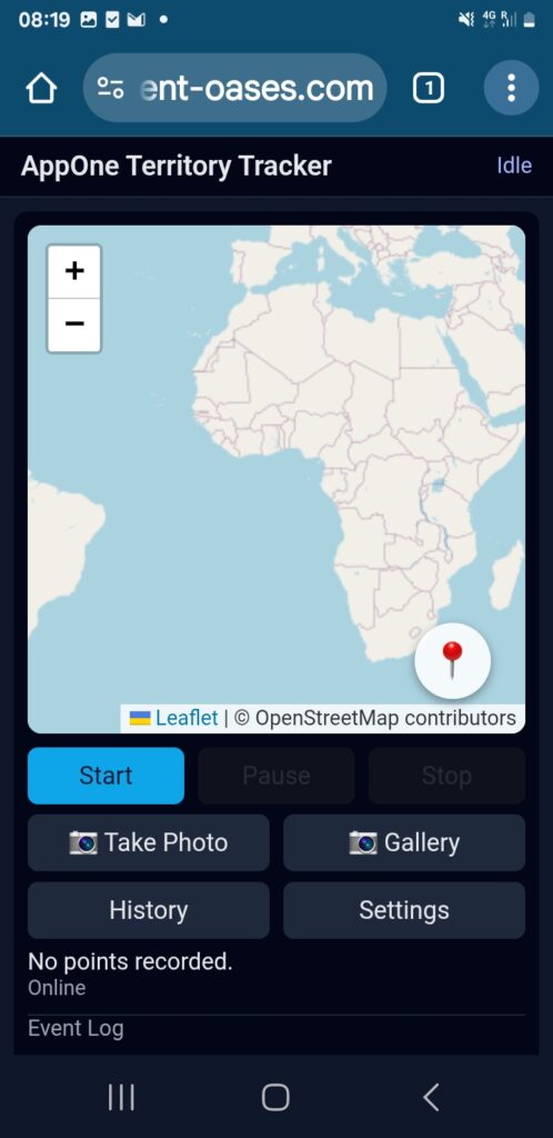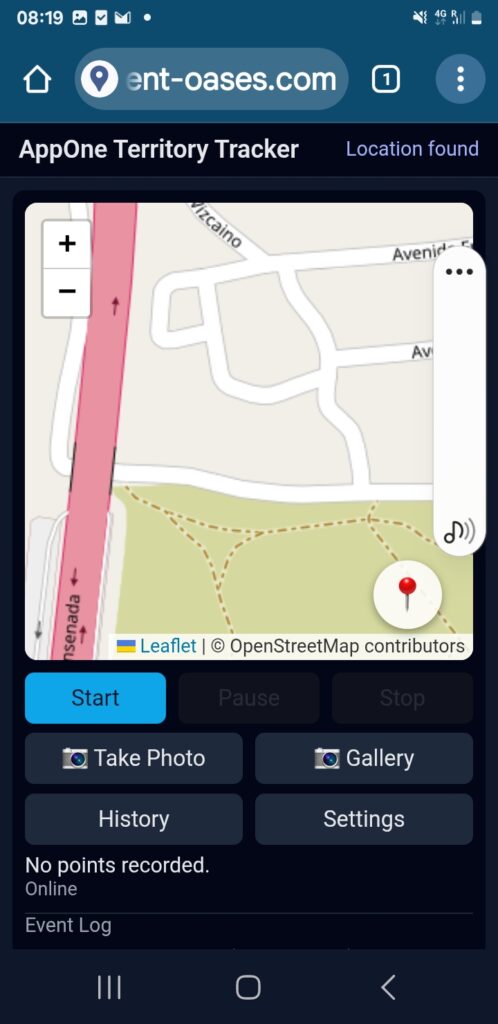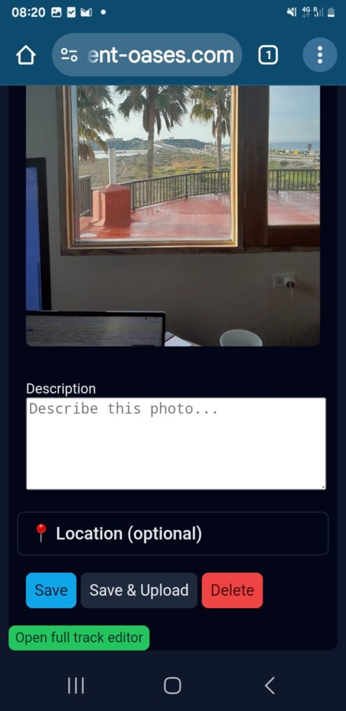 You can also take a walk or drive, by clicking Start (Then you will see the status saying “Tracking…” and you can take photos while you walk. After the walk you can upload the track and it will come to appear on the map as a green line with the photos as popups along your route.